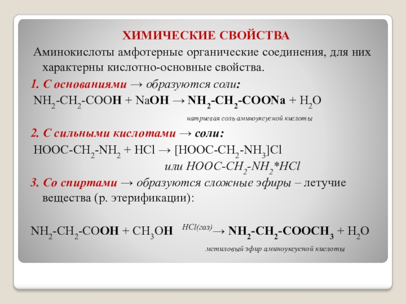 ХИМИЧЕСКИЕ СВОЙСТВА Аминокислоты амфотерные органические соединения, для них характерны кислотно-основные свойства.1. С основаниями → образуются соли: NH2-CH2-COOH + NaOH