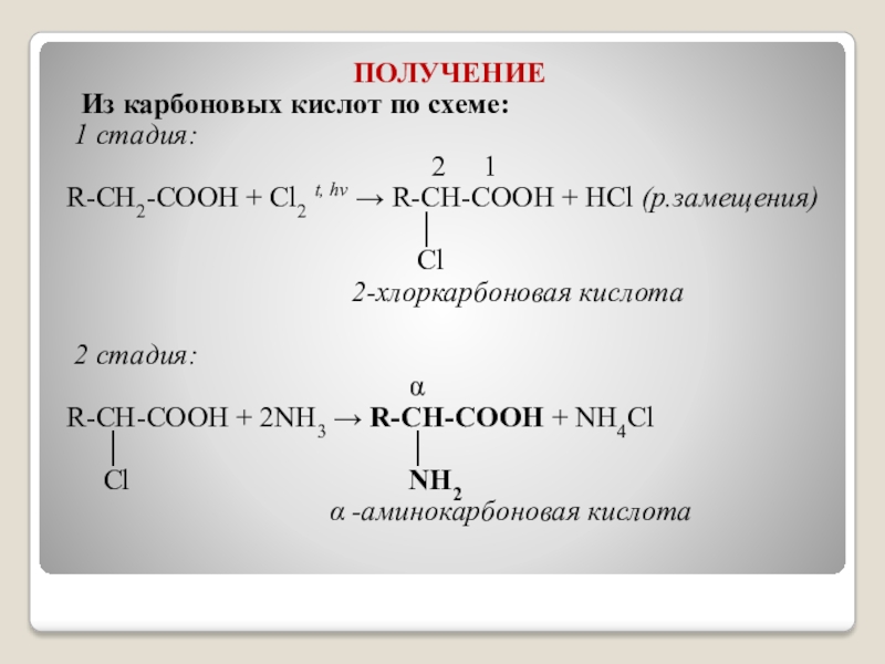 ПОЛУЧЕНИЕ  Из карбоновых кислот по схеме: 1 стадия:                                                  2     1R-CH2-COOH + Cl2 t, hν → R-CH-COOH +