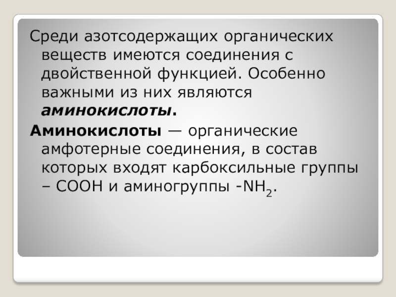 Среди азотсодержащих органических веществ имеются соединения с двойственной функцией. Особенно важными из них являются аминокислоты.Аминокислоты — органические