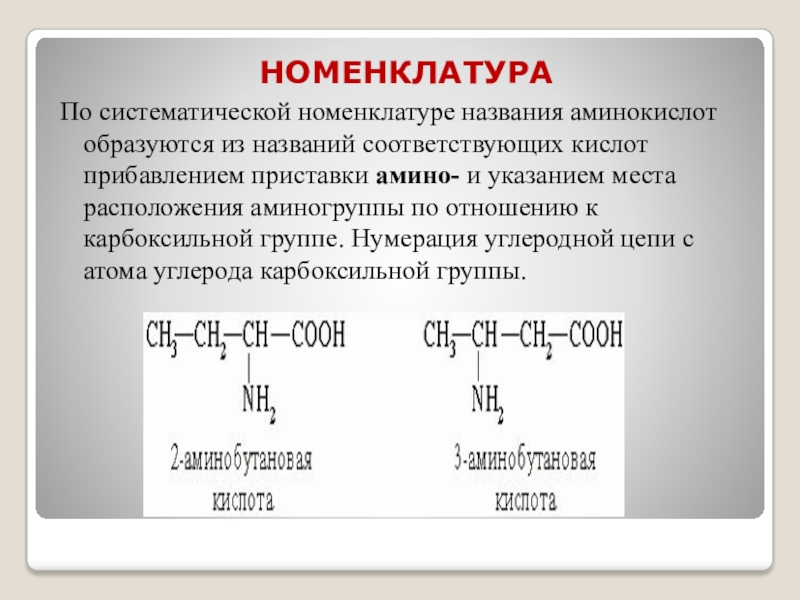 НОМЕНКЛАТУРАПо систематической номенклатуре названия аминокислот образуются из названий соответствующих кислот прибавлением приставки амино- и указанием места расположения