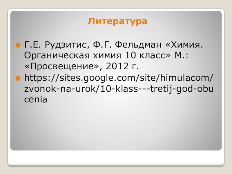ЛитератураГ.Е. Рудзитис, Ф.Г. Фельдман «Химия. Органическая химия 10 класс» М.: «Просвещение», 2012 г.https://sites.google.com/site/himulacom/zvonok-na-urok/10-klass---tretij-god-obucenia