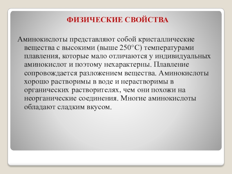 ФИЗИЧЕСКИЕ СВОЙСТВА Аминокислоты представляют собой кристаллические вещества с высокими (выше 250°С) температурами плавления, которые мало отличаются у индивидуальных