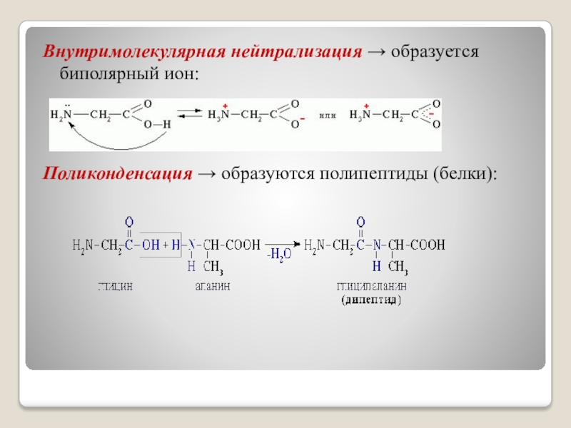Внутримолекулярная нейтрализация → образуется биполярный ион:Поликонденсация → образуются полипептиды (белки):