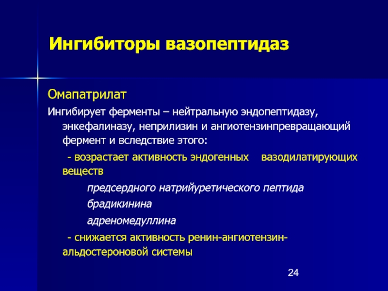 Ингибирует ферменты – нейтральную эндопептидазу, энкефалиназу, неприлизин и ангиотензинпревращающий фермент