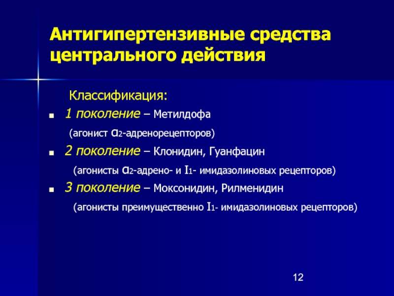 Средства, понижающие тонус вазомоторных центров: Клофелин, Гуанфацин, Метилдофа, Моксонидин, Рилменидин