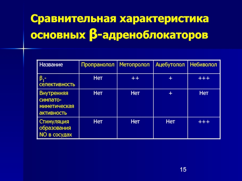 Слайд 15Сравнительная характеристика основных β-адреноблокаторов