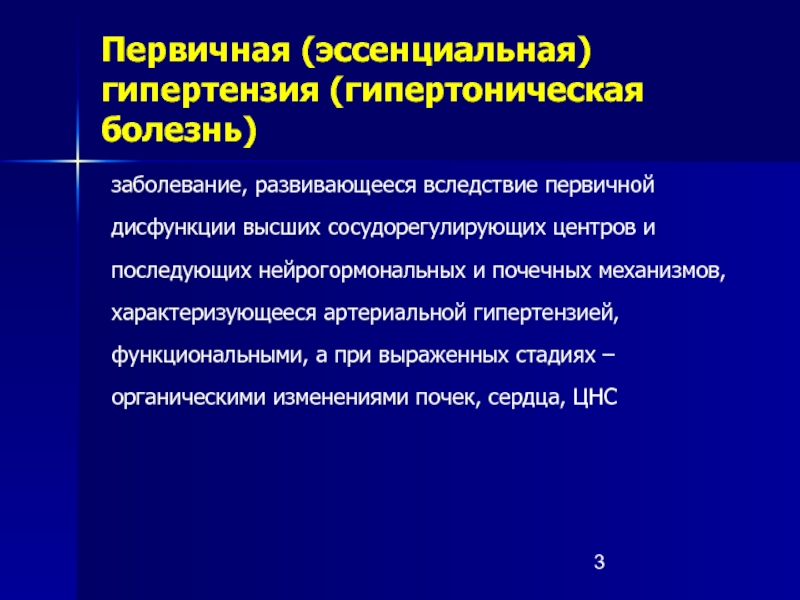 Слайд 3Первичная (эссенциальная) гипертензия (гипертоническая болезнь)