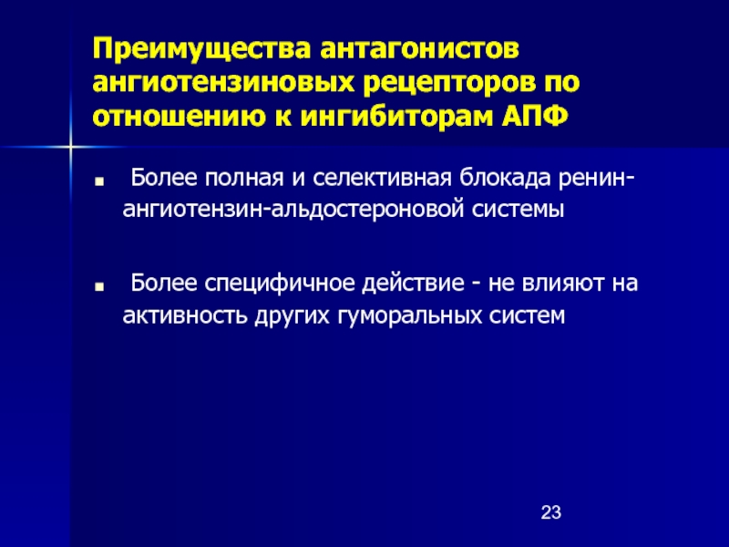 Слайд 23Преимущества антагонистов ангиотензиновых рецепторов по отношению к ингибиторам АПФ