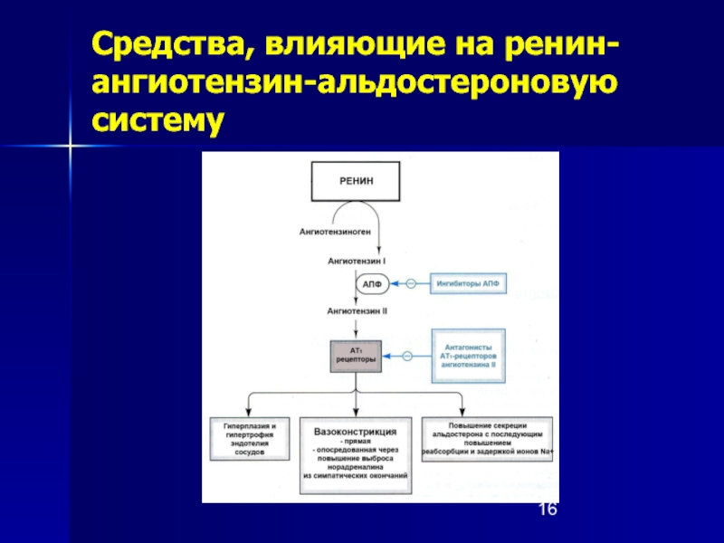 Слайд 16Средства, влияющие на ренин-ангиотензин-альдостероновую систему
