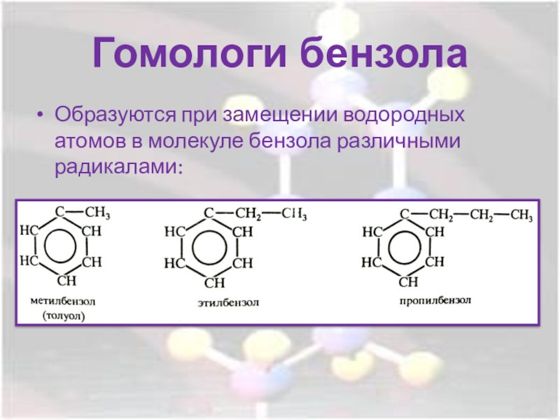 Гомологи бензолаОбразуются при замещении водородных атомов в молекуле бензола различными радикалами: