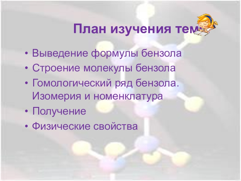 План изучения темыВыведение формулы бензолаСтроение молекулы бензолаГомологический ряд бензола.