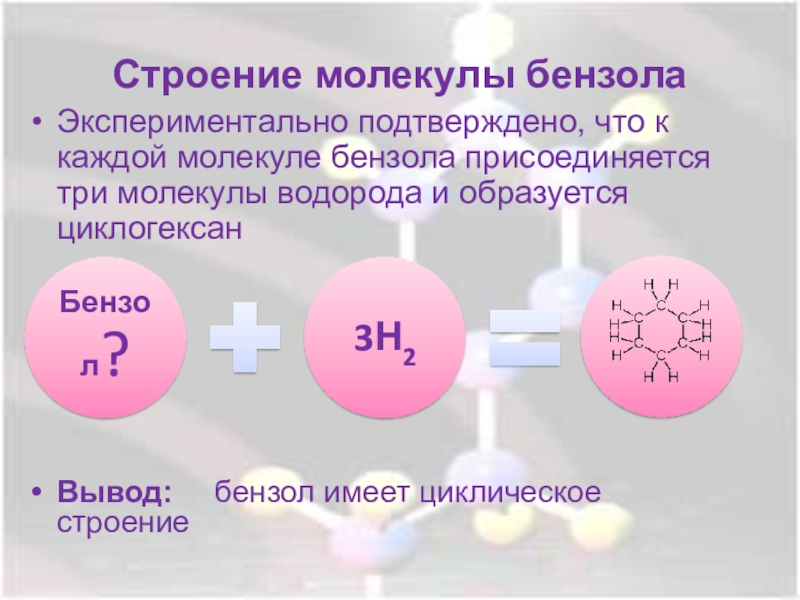 Строение молекулы бензолаЭкспериментально подтверждено, что к каждой молекуле бензола присоединяется три молекулы водорода и образуется циклогексан