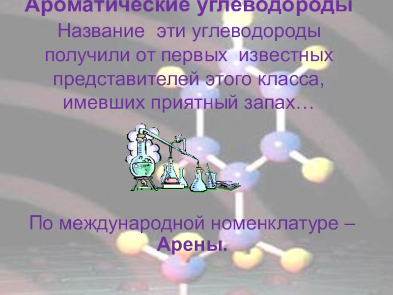 Ароматические углеводороды Название эти углеводороды получили от первых известных представителей этого класса, имевших приятный запах… По международной номенклатуре – Арены.
