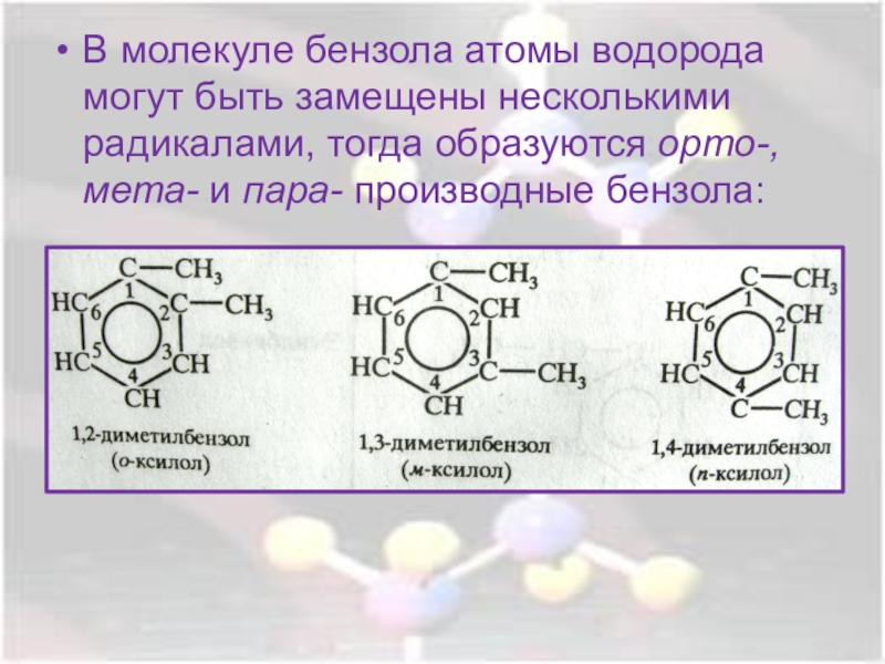 В молекуле бензола атомы водорода могут быть замещены несколькими радикалами, тогда образуются орто-, мета- и пара- производные