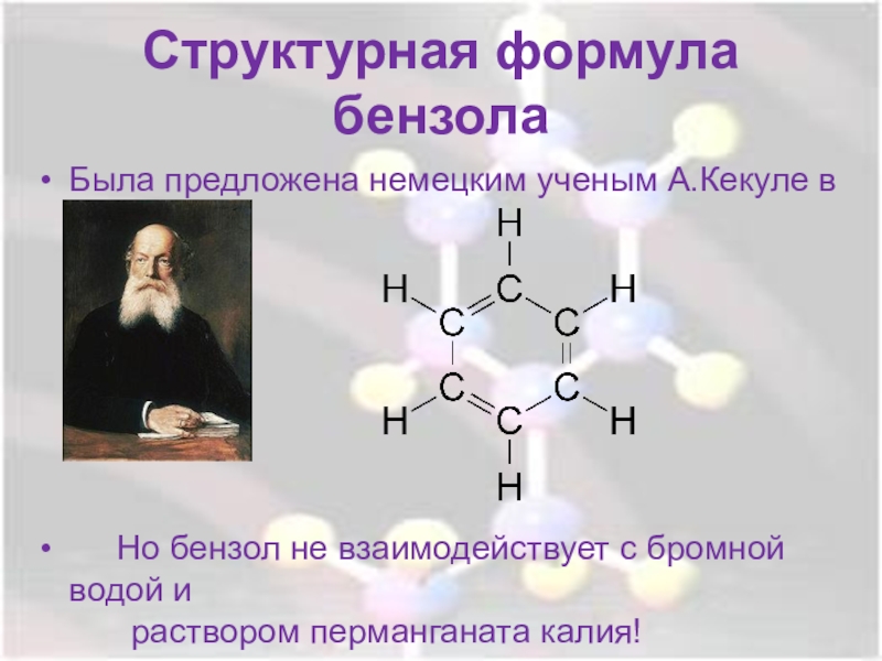 Структурная формула бензола Была предложена немецким ученым А.Кекуле в 1865 году   Но бензол не взаимодействует