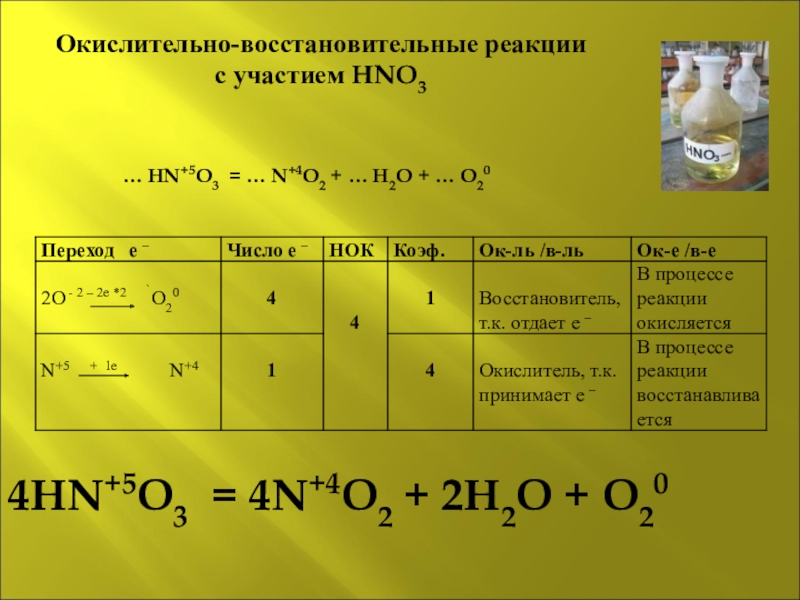 … HN+5O3 = … N+4O2 + … H2O + … O20