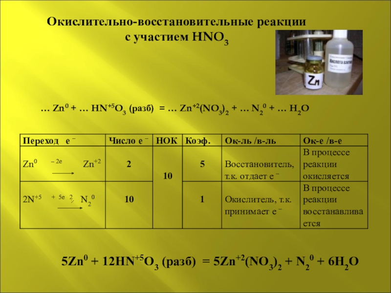 … Zn0 + … HN+5O3 (разб) = … Zn+2(NO3)2 + … N20 + … H2O