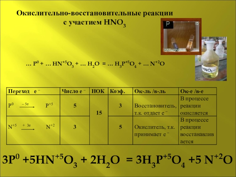 … P0 + … HN+5O3 + … H2O = … H3P+5O4 + … N+2O