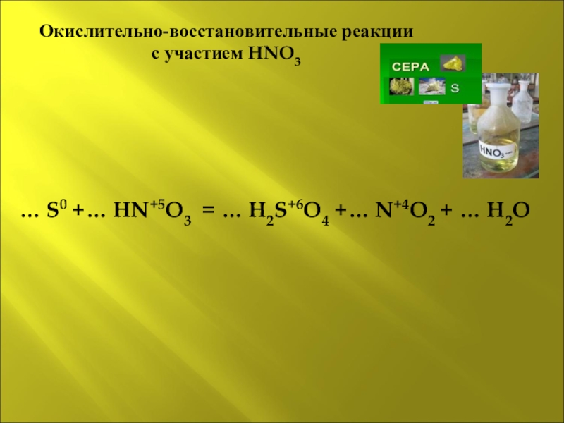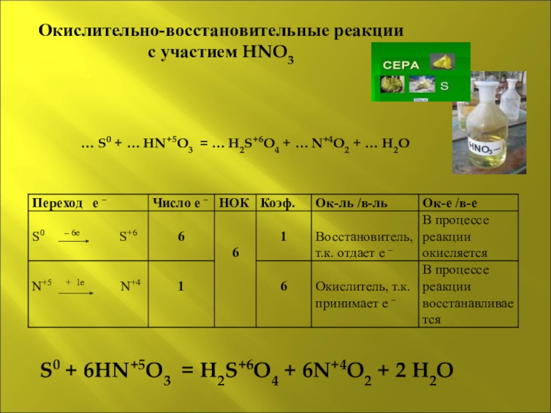 … S0 + … HN+5O3 = … H2S+6O4 + … N+4O2 + … H2O