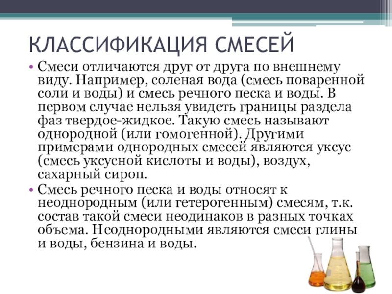 вода (смесь поваренной соли и воды) и смесь речного песка и воды. В первом случае нельзя увидеть границы раздела фаз твердое-жидкое. Такую смесь называют однородной (или гомогенной). Другими примерами однородных смесей являются уксус (смесь уксусной кислоты и воды), воздух, сахарный сироп.