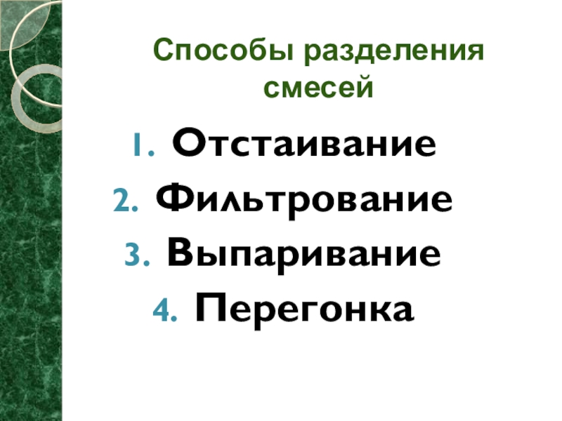 Способы разделения смесейОтстаиваниеФильтрование Выпаривание Перегонка