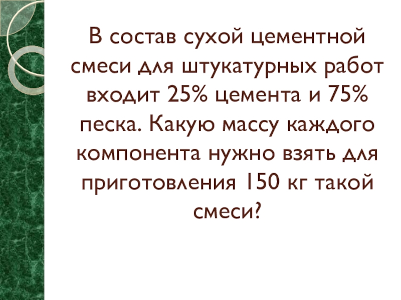 и 75% песка. Какую массу каждого компонента нужно взять для приготовления 150 кг такой смеси?
