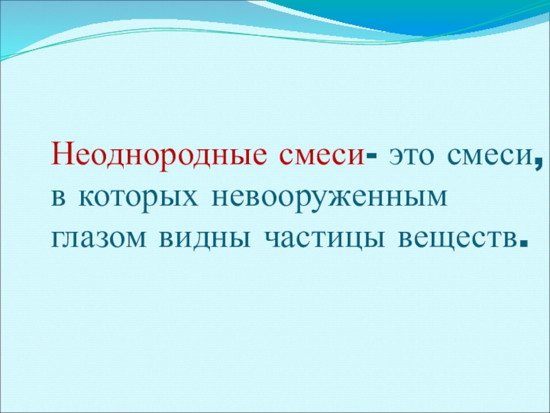 Неоднородные смеси- это смеси, в которых невооруженным глазом видны частицы веществ.