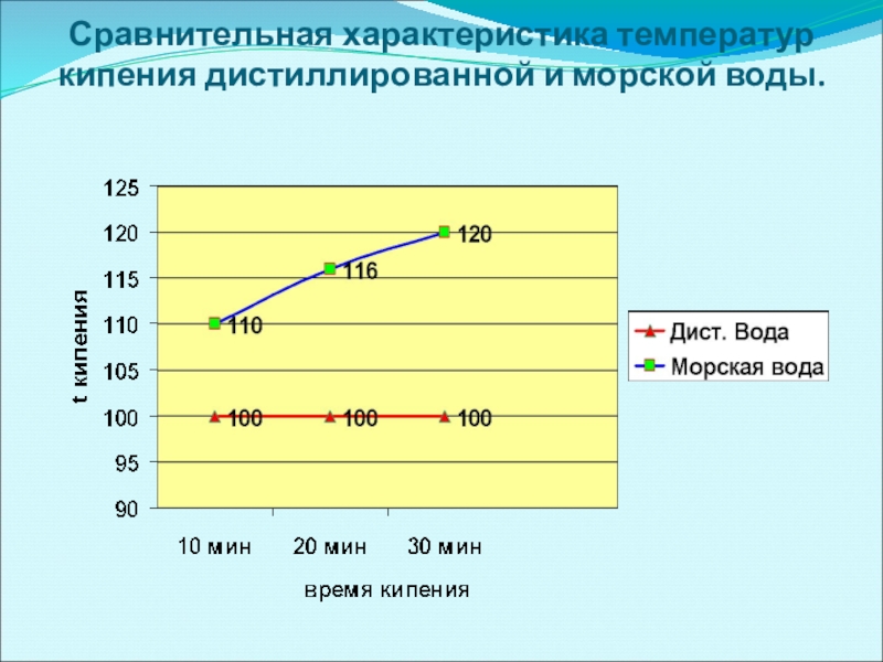 Слайд 14Сравнительная характеристика температур кипения дистиллированной и морской воды.