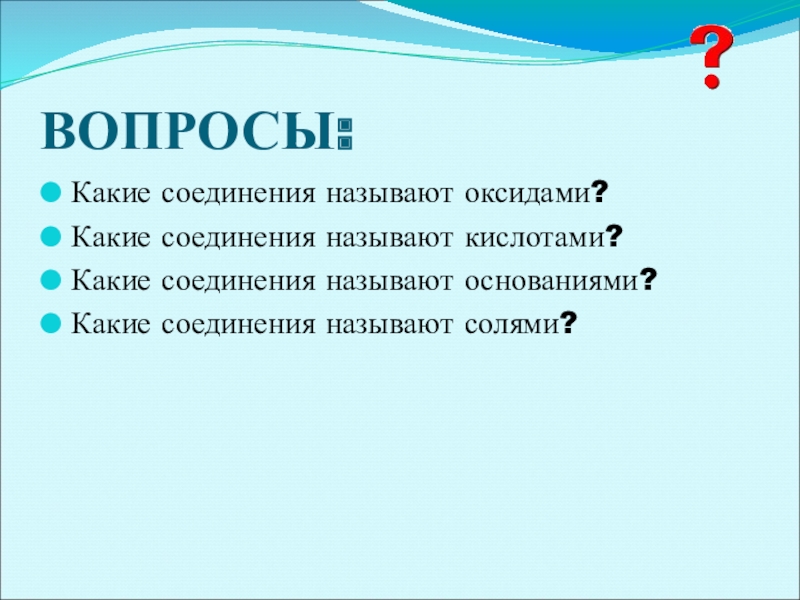ВОПРОСЫ:Какие соединения называют оксидами?Какие соединения называют кислотами?Какие соединения называют основаниями?Какие соединения называют солями?
