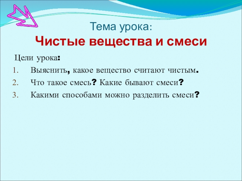 Тема урока: Чистые вещества и смесиЦели урока:Выяснить, какое вещество считают чистым. Что такое смесь? Какие бывают смеси?Какими