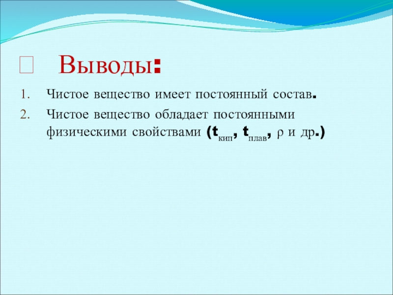 ? Выводы:Чистое вещество имеет постоянный состав.Чистое вещество обладает постоянными физическими свойствами (tкип, tплав, ρ и др.)