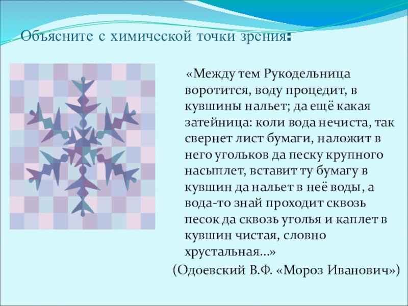 Объясните с химической точки зрения:  «Между тем Рукодельница воротится, воду процедит, в кувшины нальет; да ещё