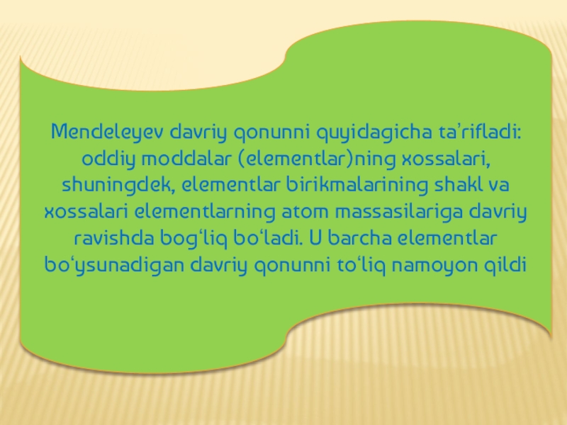 Слайд 9Mendeleyev davriy qonunni quyidagicha taʼrifladi: oddiy moddalar (elementlar)ning xossalari, shuningdek, elementlar