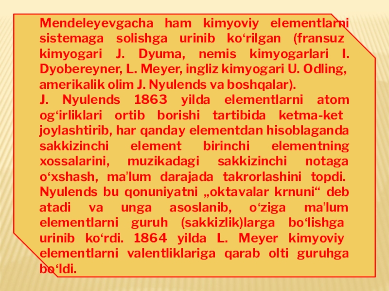Слайд 6Mendeleyevgacha ham kimyoviy elementlarni sistemaga solishga urinib koʻrilgan (fransuz kimyogari J.