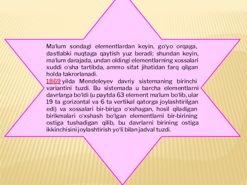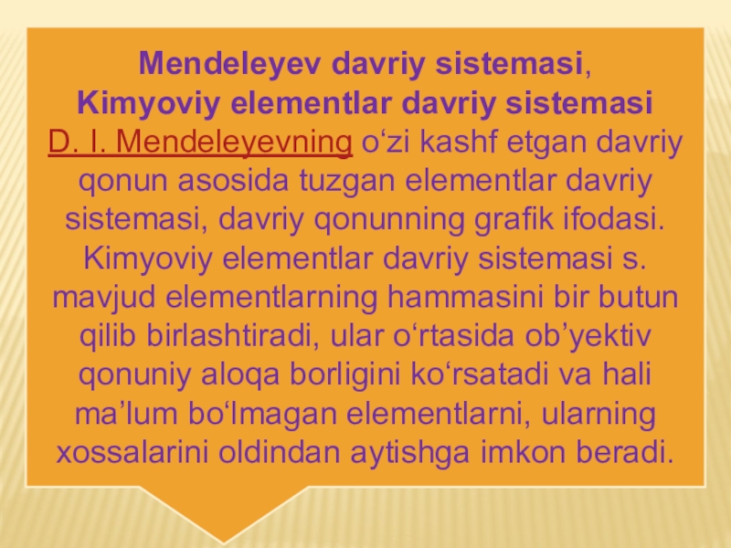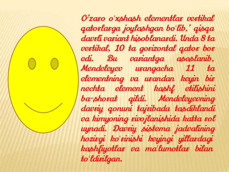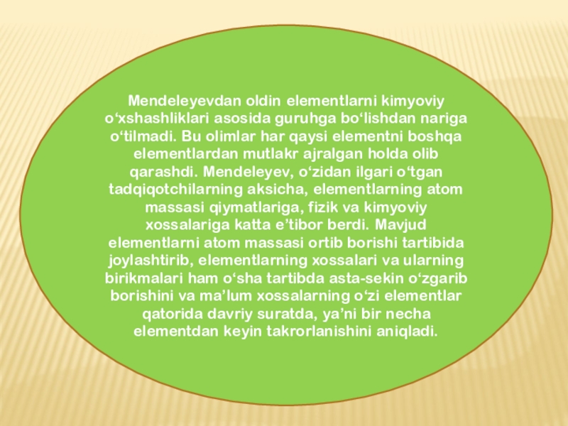 Слайд 7Mendeleyevdan oldin elementlarni kimyoviy oʻxshashliklari asosida guruhga boʻlishdan nariga oʻtilmadi. Bu