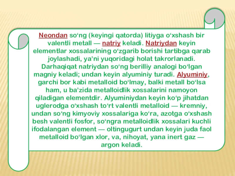 Слайд 12Neondan soʻng (keyingi qatorda) litiyga oʻxshash bir valentli metall — natriy keladi. Natriydan keyin elementlar xossalarining oʻzgarib