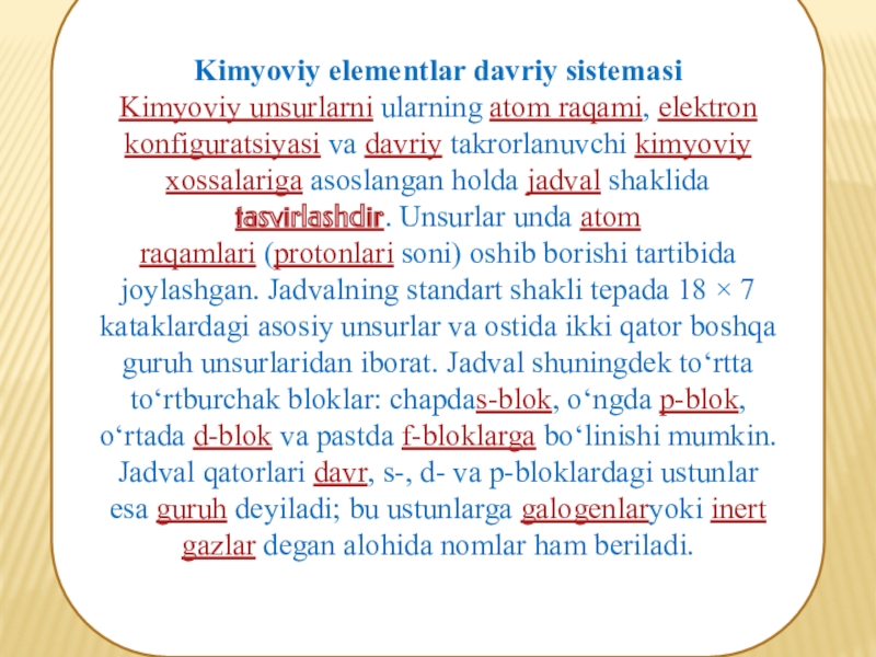 Слайд 21. Kimyoviy elementlar davriy sistemasi