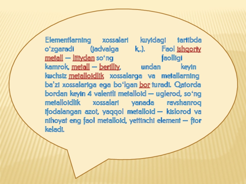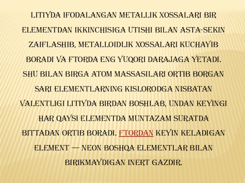 Слайд 8litiyda ifodalangan metallik xossalari bir elementdan ikkinchisiga utishi bilan asta-sekin zaiflashib,
