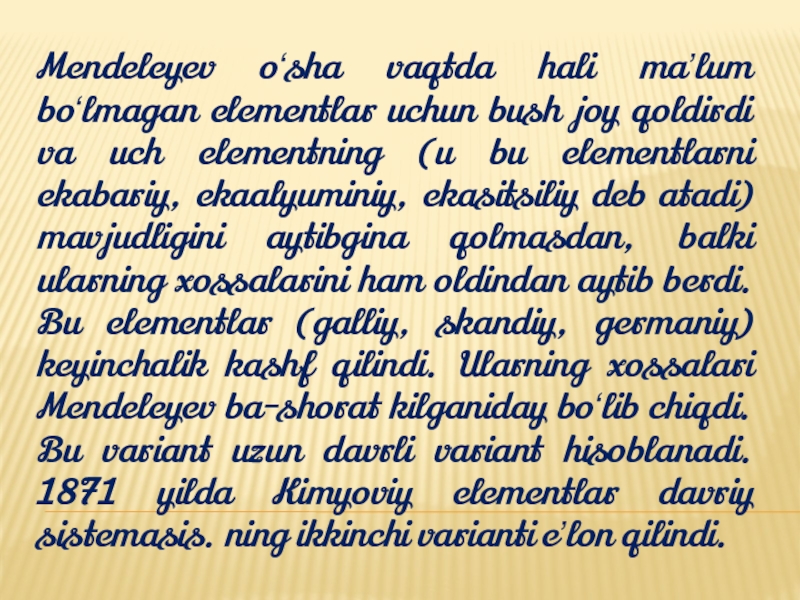 va uch elementning (u bu elementlarni ekabariy, ekaalyuminiy, ekasitsiliy deb atadi) mavjudligini aytibgina qolmasdan, balki ularning xossalarini ham oldindan aytib berdi. Bu elementlar (galliy, skandiy, germaniy) keyinchalik kashf qilindi. Ularning xossalari Mendeleyev ba-shorat kilganiday boʻlib chiqdi. Bu variant uzun davrli variant hisoblanadi. 1871 yilda Kimyoviy elementlar davriy sistemasis. ning ikkinchi varianti eʼlon qilindi.