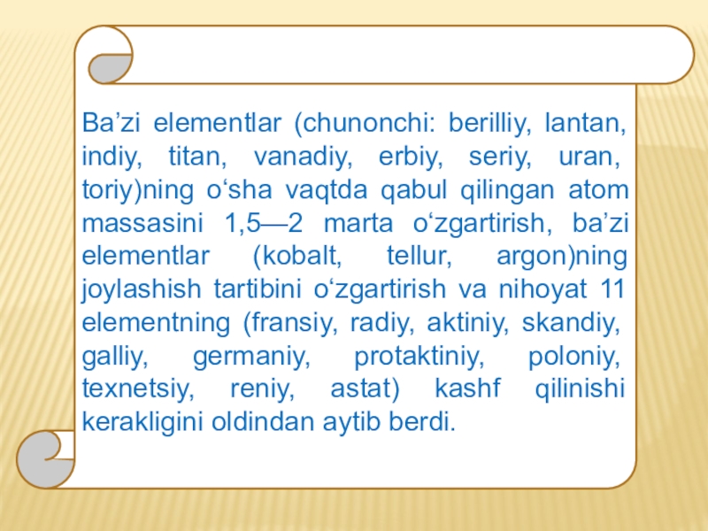 toriy)ning oʻsha vaqtda qabul qilingan atom massasini 1,5—2 marta oʻzgartirish, baʼzi elementlar (kobalt, tellur, argon)ning joylashish tartibini oʻzgartirish va nihoyat 11 elementning (fransiy, radiy, aktiniy, skandiy, galliy, germaniy, protaktiniy, poloniy, texnetsiy, reniy, astat) kashf qilinishi kerakligini oldindan aytib berdi.