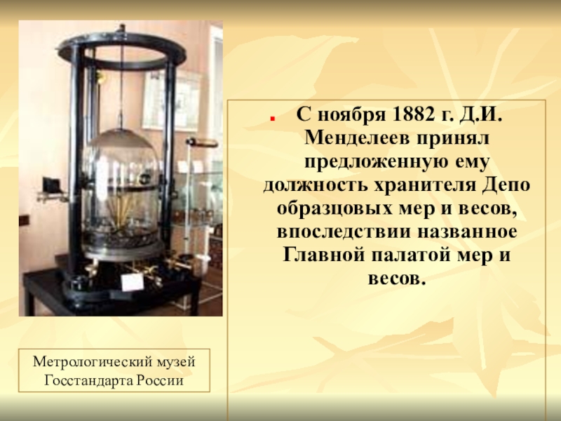 Слайд 20 С ноября 1882 г. Д.И.Менделеев принял предложенную ему должность хранителя