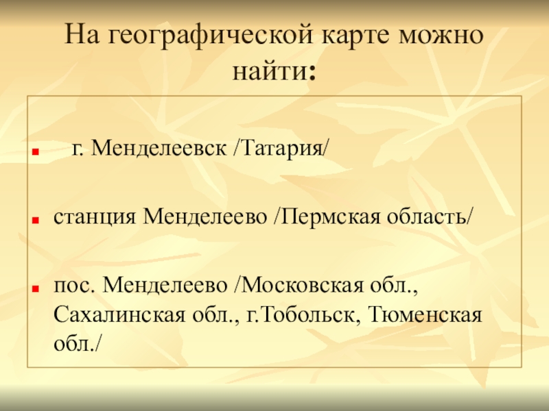 пос. Менделеево /Московская обл., Сахалинская обл., г.Тобольск, Тюменская обл./