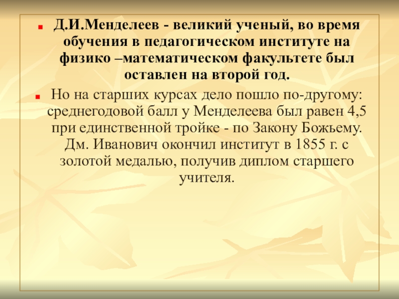 Слайд 8Д.И.Менделеев - великий ученый, во время обучения в педагогическом институте на