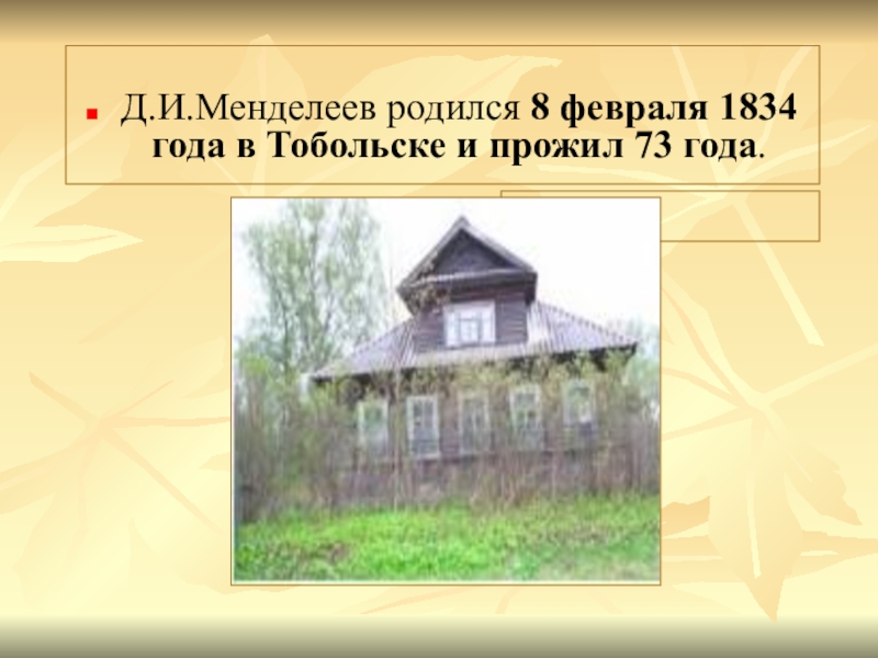Д.И.Менделеев родился 8 февраля 1834 года в Тобольске и прожил