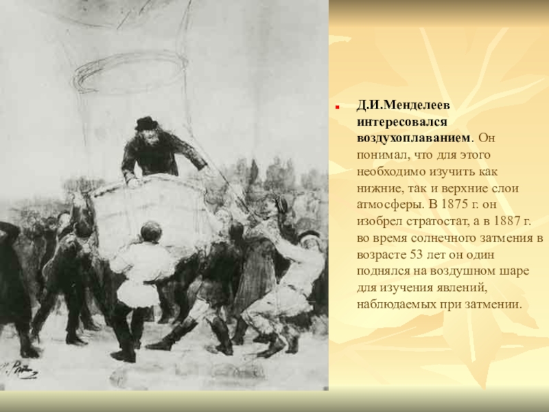 Д.И.Менделеев интересовался воздухоплаванием. Он понимал, что для этого необходимо изучить как