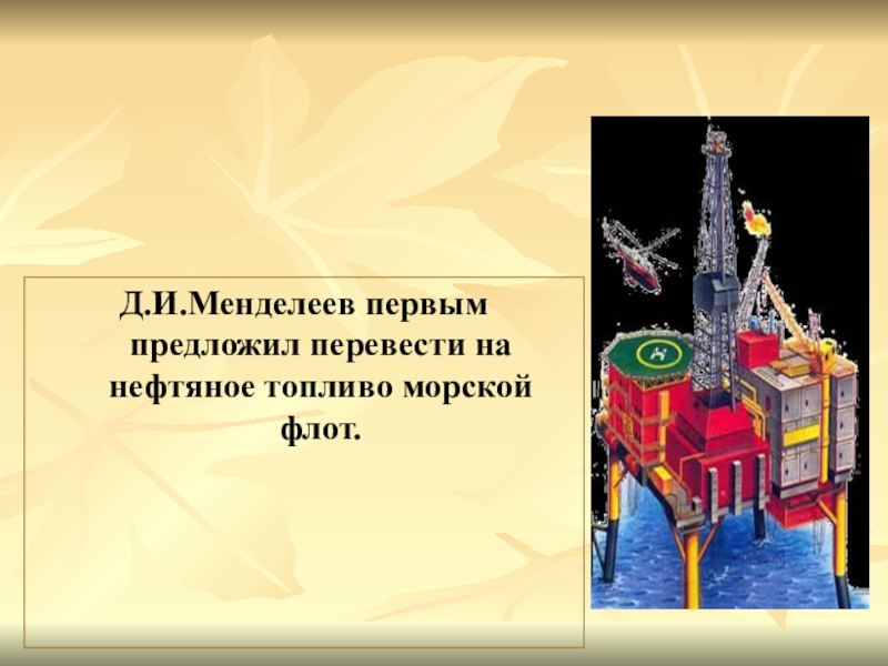 Слайд 14Д.И.Менделеев первым предложил перевести на нефтяное топливо морской флот.