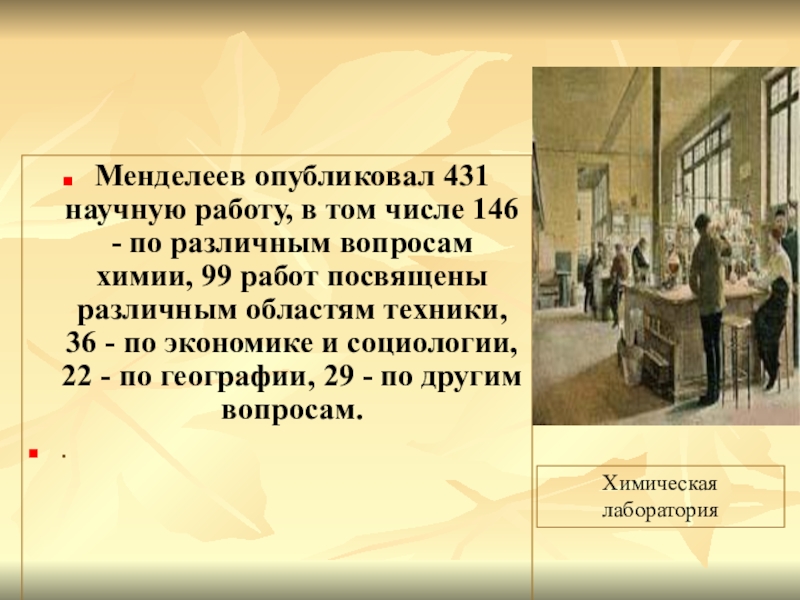 Слайд 19Менделеев опубликовал 431 научную работу, в том числе 146 - по