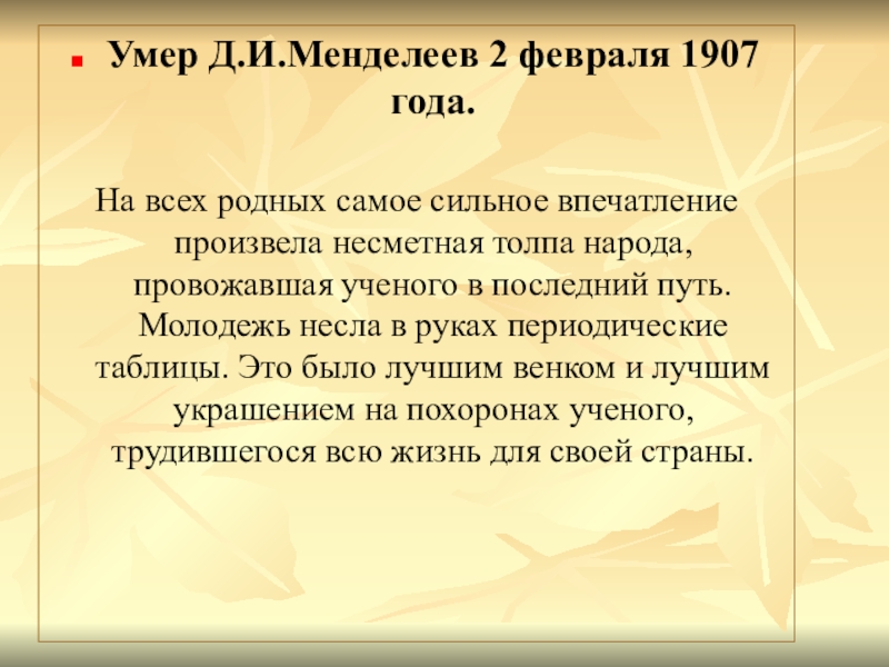 Слайд 27Умер Д.И.Менделеев 2 февраля 1907 года.