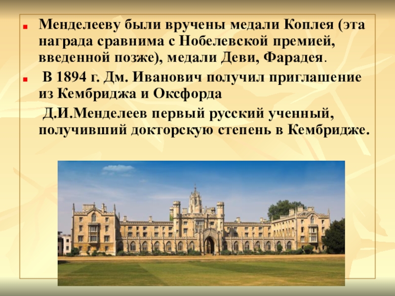 Д.И.Менделеев первый русский ученный, получивший докторскую степень в Кембридже.