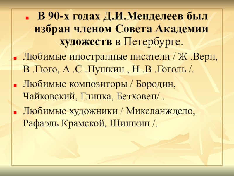 Слайд 12 В 90-х годах Д.И.Менделеев был избран членом Совета Академии художеств
